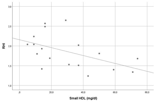 In our sample, the average RHI was 1.9. Except for the significant inverse correlation of small HDL and intermediate HDL with RHI (r = −0.561, p = 0.015 and r = −0.548, p = 0.019, consecutively), no other significant correlation was found between RHI and other lipoprotein levels (see Table 2). In stepwise multiple linear regression analysis, small HDL (beta = −0.507, p = 0.032) was the only significant contributor in the model predicting RHI. The VIF of all variables assessed in this model was <5. For details, see Table 1 and Table 2, Figure 3 and Figure 4.