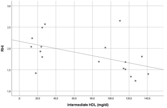 Correlation of intermediate high-density lipoprotein levels with reperfusion hyperemia index (r = −0.548, p = 0.019).