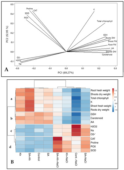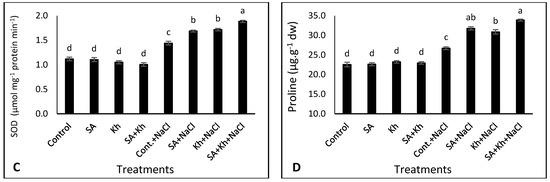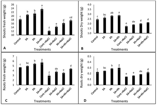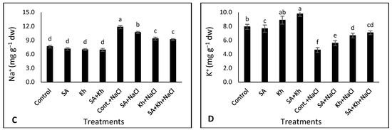 - Soil application of K-humate + foliar application of salicylic acid + 50 mM NaCl (Kh + SA + 50 NaCl);