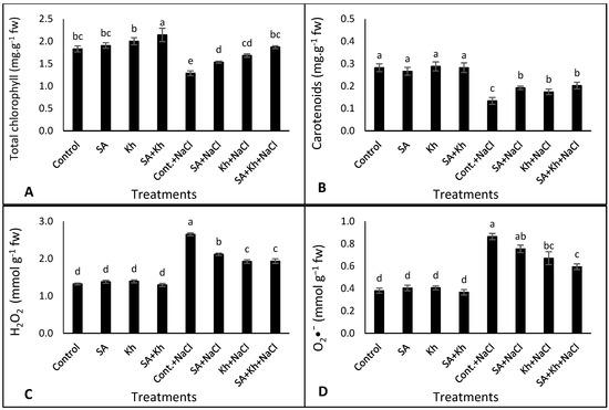 3.2. Effect of Kh and SA on Leaf Pigments, O2•−, and H2O2