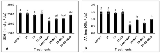 - Nawaz, M.; Ashraf, M.Y.; Khan, A.; Nawaz, F. Salicylic Acid– and Ascorbic Acid–Induced Salt Tolerance in Mung bean (Vigna radiata (L.) Wilczek) Accompanied by Oxidative Defense Mechanisms. J. Soil Sci. Plant Nutr. 2021, 21, 2057–2071. [Google Scholar] [CrossRef]