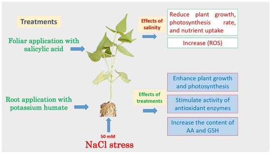 El-Beltagi, H.S.; Al-Otaibi, H.H.; Parmar, A.; Ramadan, K.M.A.; Lobato, A.K.d.S.; El-Mogy, M.M. Application of Potassium Humate and Salicylic Acid to Mitigate Salinity Stress of Common Bean. Life 2023, 13, 448. https://doi.org/10.3390/life13020448