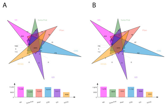 For the comprehensive analysis of transcripts, we annotated the sequencing data for both the transcripts and unigenes in six different databases, including COG, GO, KEGG, NR, Pfam, and Swiss-Prot. The total number of annotated genes for each database is presented in Figure 1. In total, 24,213 transcripts and 17,853 unigenes were annotated (Figure 1). The Venn diagram of total transcripts and unigenes was obtained according to these six protein databases (Figure 1). It shows 6003 mutual genes for all transcript data (Figure 1A), accounting for 25% of total expressed genes. For unigenes, it shows 4239 mutual genes (Figure 1B), accounting for 24% of the expressed genes.