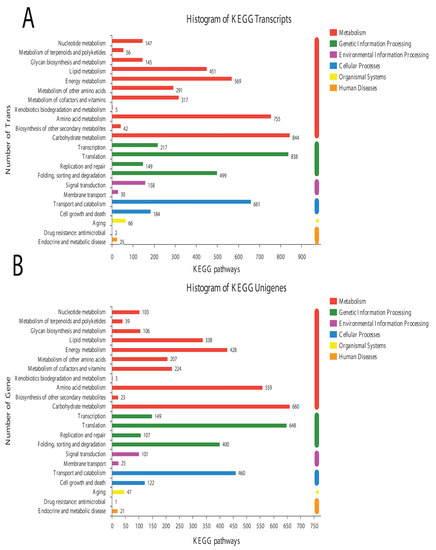 Historgram based on the total number of transcripts (A) and unigenes from Curvularia trifolii isolated from strawberry leaves. (B) The identified genes from transcript data can be classified into six broad groups through KEGG analysis.