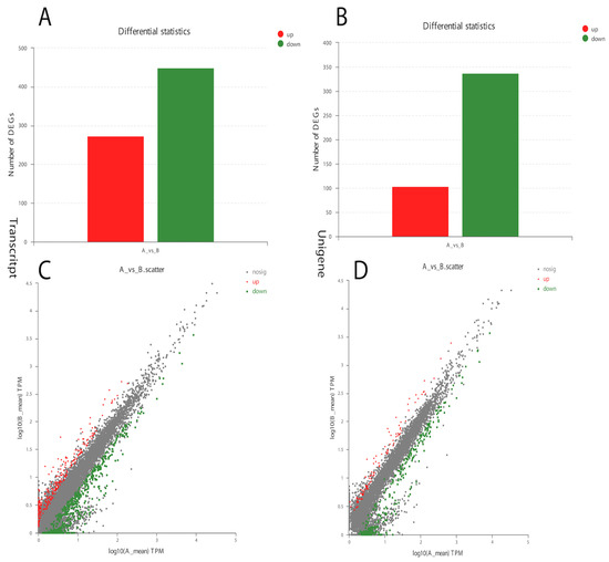 Differential gene expression in α-solanine-treated Curvularia fungi. (A). Number of transcript DEGs in the control and treated samples. (B). Number of up-regulated and down-regulated unigene DEGs. (C,D) represent up-regulated and down-regulated DEGs.
