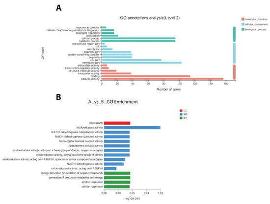 Based on GO annotation results, changes in important biological processes were identified where the maximum number of genes was related to oxidoreductase activity and cellular respiration. The GO enrichment analysis of 9425 DEGs validated the annotation results regarding the genes related to oxidoreductase activity and cellular respiration (Figure 5B).