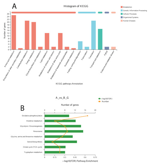 A total of 12 up-regulated and 198 down-regulated genes were identified through the KEGG annotation pathway (Figure 6). The KEGG annotation of up-regulated genes identified the high expression of genes related to amino acid, carbohydrate, energy, and lipid metabolism. Furthermore, the genes related to cellular growth and aging were also up-regulated, while the genes related to metabolism, nucleic acid processing, protein folding and transport, and aging were down-regulated (Figure 6). KEGG-based gene enrichment analysis revealed eight different pathways that were differentially expressed during α-solanine treatment. These pathways included oxidative phosphorylation, histidine, tryptophan, glycine, threonine and serine metabolism, peroxisomes and steroid biosynthesis, and the citric acid cycle.