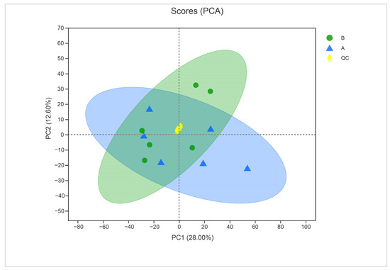 To ensure the quality of acquired metabolite data, we used PCA to validate the results. The close clustering of QC samples in the PCA plot indicated the reliable quality of the data (Figure 7). The two principal component analyses of metabolites from treated and untreated samples indicated a clear difference between metabolites (28% for PC1 and 12.60% for PC2).