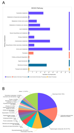 Classification of metabolites through the KEGG pathway (A) and HDMB (B) analysis. The metabolites related to lipid metabolism are highly expressed in the α-solanine-treated Curvularia fungi.