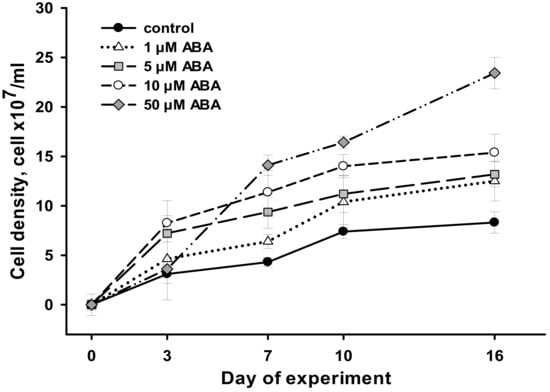 Cell density of Chlorella zofingiensis cultured in a range of ABA concentrations of 1 µM to 50 µM during 16 days of experiment. Data are shown as the mean ± SD, n = 12. Control cultures did not contain ABA.