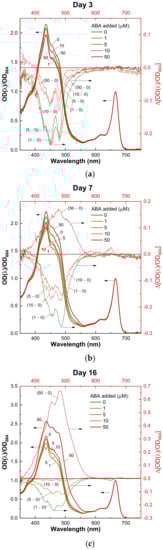 In addition to the analysis of the total CR content, we studied the changes of the normalized absorbance spectra of the pigment in DMSO extract of the C. zofingiensis cells exposed to different ABA concentrations in order to reveal the trends of the CR composition change. In line with the dynamics of the CR culture content depicted above, the cultures after 3-day incubation in the presence of ABA displayed a decline in the relative amplitude of the absorption bands in the blue-green region of the visible part of the spectrum. Overall, the cultures exposed to ABA concentrations showed a sizeable decline in the absorption bands attributable to the primary (photosynthetic) CR, apparent as negative peaks on the difference absorbance spectra (Figure 2A, right scale). This trend was also documented in the cultures exposed to ABA for 7 days with a single exception. Namely, the culture exposed to 50 µM ABA demonstrated an increase in the relative absorption of the pigments with maxima located in the band of 480–490 nm (Figure 2B, right scale), resembling the absorbance spectra of secondary (keto-)carotenoids commonly found in microalgae [65]. These changes became the most remarkable after 16 days of the experiment (Figure 2C).