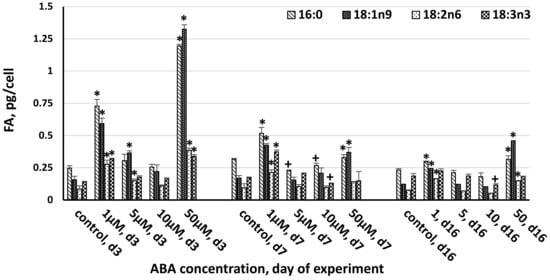The effect of abscisic acid on the composition of major fatty acids (>3% of total FAs) in the cell of Chlorella zofingiensis on the 3rd, 7th, and 16th days of experiment (d3, d7, and d16, respectively). Statistically significant differences from the controls (p < 0.05) are indicated, where *—significantly greater than the control and +—significantly lower than the control. Data are shown as the mean ± SD, n = 4. Control cultures did not contain ABA.