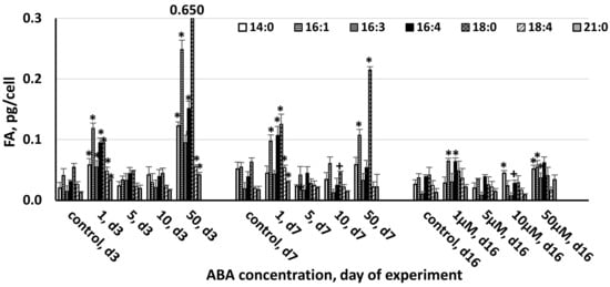 Minor FAs were also most affected by 1 and 50 μM ABA. Similarly to the major FAs, the effect of ABA on their synthesis was mitigated toward the end of the experiment. The greatest increase in the accumulation of the minor fatty acids (1–3% of TFA) was observed at 50 μM ABA on the third day, with myristic (C14:0), palmitoleic (C16:1), cis-hexadecatrienoic (C16:3), hexadecatetraenoic (C16:4), octadecanoic (C18:0), stearidonic (C18:4), and heneicosanoic (C21:0) acids demonstrating their maximum concentrations of 0.123, 0.249, 0.095, 0.650, 0.055, and 0.0421 pg/cell, respectively (Figure 4).