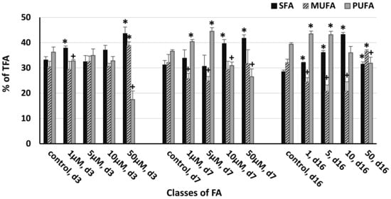 Considering the classification of FAs, it should be noted the following: in control samples, the distribution of classes was similar on days 3 and 7 (PUFA > SFA ≥ MUFA), and, toward the end of experiment, the dominance of PUFA over other classes was evident (Figure 5). When C. zofingiensis cells were exposed to the range of ABA concentrations, the differences in the distribution of classes were apparent. The percentage of SFA was elevated at 1 and 50 μM ABA on day 3, at 10 and 50 μM ABA on day 7, and at all the tested ABA concentrations at the end of the experiment (day 16). The percentage of MUFA was increased only at 50 μM ABA (on days 3 and 16), while 1 and 5 μM ABA (on day 7) and 1, 5, and 10 μM ABA (on day 16) significantly lowered its percent. PUFA fraction increased at 1 and 5 μM ABA (on days 7 and 16) and declined at 1 μM (on day 3), 10 μM (on day 7), and 50 μM (at any sampling day). In other cases, no effect of ABA on the classification of FAs was observed compared to the control.