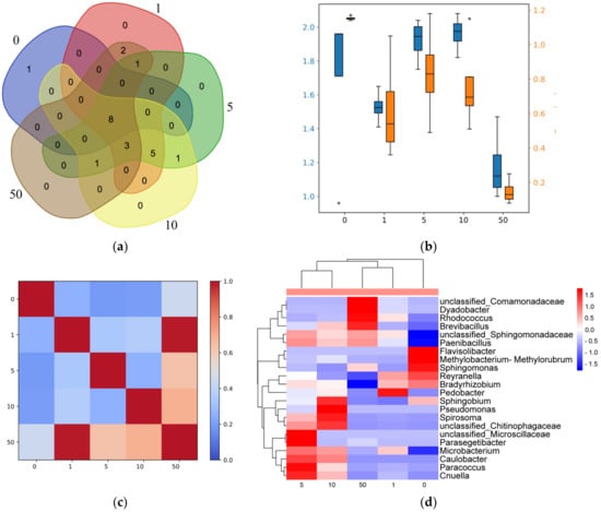 Metagenomic analysis of the Chlorella zofingiensis cultures incubated for 16 days in the presence of different ABA concentrations: 0—0 μM, 1—1 μM, 5—5 μM, 10—10 μM, 50—50 μM. Interception between microbiomes of cultures is presented as a Venn diagram (a). The box plot represents mean values (n = 4) of microbial community biodiversity (Shannon index, blue) and evenness (Simpson index, orange) in studied cultures (b). Comparison of the cultures’ similarity is estimated by the Morisita index of β-diversity and depicted as a heatmap (c). Cultures’ microbiomes similarity was observed on a genus level on a clustered heatmap (d).