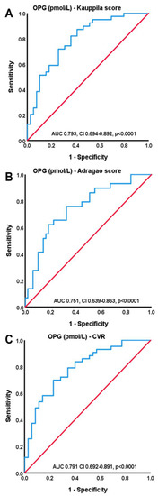 Figure 1 shows differences in OPG levels according to the severity of cardiovascular risk and VCs, whereas the ROC curves depicted in Figure 2 show the importance of OPG serum levels in the severity of VCs as this was estimated by the Kauppila score (AUC 0.793, CI 0.694–0.892, p < 0.001), Adragao score (AUC 0.751, CI 0.639–0.863, p < 0.001) and cardiovascular risk (AUC 0.791, CI 0.692–0.891, p < 0.001).