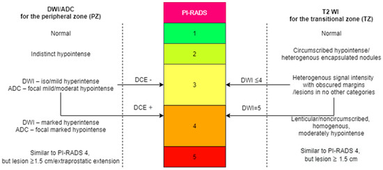 For a more standardized imaging interpretation of prostate lesions, the European Society of Urogenital Radiology (ESUR) created the prostate imaging reporting and data system (PI-RADS), which currently is in version 2 (v2) [24,25]. The PI-RADS score is a useful tool for improving the early diagnosis and treatment of PCa. The PI-RADS v2 for mpMRI can be found in the scheme below (Figure 1). There are 1–5 points that have to be assigned for each lesion, depending on how suspicious it appears:
