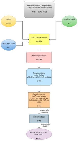 PRISMA (Preferred Reporting Items for Systematic Reviews and Meta-Analyses) guidelines were used to select the studies for this review [29]. The current review is based on bibliographic searches in the PubMed database, Google Scholar, Cochrane Library, and Scopus. The searches were conducted manually as well as using MeSH terms (on the PubMed database). Initially, papers published in the last 5 years that were related to MRI use in the prostate cancer, specifically papers that included a comparison of bp- and mpMRI, were selected. The most relevant articles were chosen based on their title, abstract, and a quick read of the entire manuscript. Papers published in languages other than English, papers with only abstracts available, and duplicates were all excluded. First, the articles were manually searched using the keywords “prostate cancer” and each of the imaging methods individually—“multiparametric MRI”, “biparametric MRI”, and “multiparametric vs. biparametric MRI”. Following this, another PubMed search was conducted using MeSH terms, with the following keywords: ((“Prostate Cancer”[Mesh]) AND “multiparametric MRI”[Mesh]) AND “biparametric MRI”[Mesh]. As there are so many published papers on mpMRI, we decided to focus on the most relevant reviews and meta-analyses, which cover the majority of the studies.