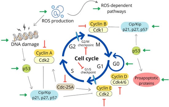Cell cycle progression is an essential mechanism that ensures DNA replication, cell growth and division, and organism renewal. However, the overexpression of growth factors or mutations in genes/lack of controlling tumor suppressor proteins leads to the inability of cells to exit the cell cycle and subsequent uncontrolled cell division. For this reason, modulation and targeting of cell cycle control mechanisms represent a suitable therapeutic target for antitumor therapy [51]. The cell cycle is strictly regulated in healthy cells by several proteins such as cyclins, cyclin-dependent kinases (CdK), and CdK-activating kinases (CAKs). Topoisomerases, tubulins, various enzymes, and proteins from the family of cyclin-dependent kinase inhibitors also participate in the progression of the cell cycle. DNA damage can lead to irreversible cell cycle arrest at various phases of the cycle, which is directly linked to the activation of a complex machinery resulting in cell death [52,53].