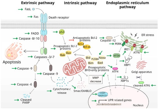 Molecular mechanisms of extrinsic, intrinsic and endoplasmic reticulum pathways involved in AgNPs-induced apoptosis. Green arrow—activation by AgNPs; red arrow—inhibition by AgNPs. Original figure made for this review using the Canva software.