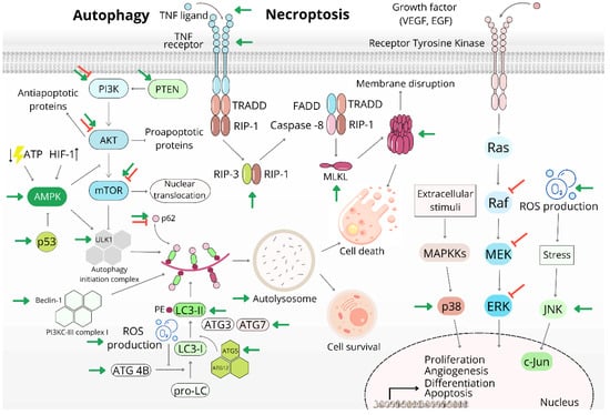 Autophagic, necroptotic and MAPK signaling pathways involved in the mechanism of action of AgNPs. Green arrow—activation by AgNPs; red arrow—inhibition by AgNPs. Original figure made for this review using the Canva software.