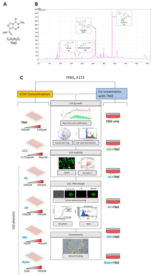 (A) ChemDraw structure of TMZ. (B) The spectroscopic properties of OLE includes the investigated phenolics, OL, HT, TYR, and rutin. The figure was modified from our previous article from Ercelik and colleagues [22]. (C) Schematic presentation of the experimental workflow. A172 and T98G cells were treated with the IC50 concentrations of TMZ, OLE, OL, HT, TYR, and rutin. In addititon, the anti-GB effect of combined TMZ + OLE or TMZ + OL, TMZ + HT, TMZ + TYR, and TMZ + rutin were compared with TMZ-only. TMZ: temozolomide, OLE: Olea europaea leaf extract, OL: oleuropein, HT: hydroxytyrosol, TYR: tyrosol.