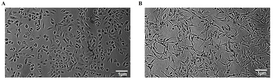 Morphological features of human GB cells. (A) Polymorphic morphology of T98G cells consisting of fibroblast-like, polygonal, and spherical cells. (B) Monomeric morphology of A172 cells consisting of fibroblast-like cells.