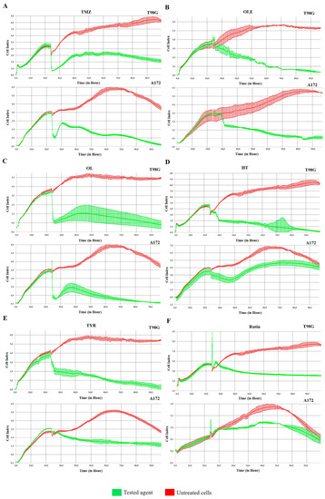 T98G and A172 cells (15 × 103) were plated onto an E-Plate 16 (ACEA Biosciences, San Diego, CA, USA) with the standard medium. Cells were treated with IC50 doses determined by WST-1 analysis of TMZ-only, OLE-only, and OLE’s phenolic compounds. Cell proliferation indexes were determined every 30 min over 96 h by measuring electrical impedance using the xCELLigence biosensor cell analysis system (ACEA Biosciences, USA).