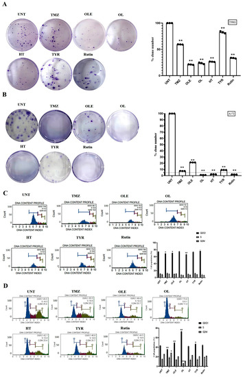 The number of colonies formed by untreated GB cells was normalized to 100%. Compared with normalized colony numbers obtained from untreated cells, TMZ reduced the number of colonies formed by T98G and A172 cells by 1.7- and 13.4-fold, respectively (Figure 5A,B). In addition, after OLE-only treatment, the number of colonies formed by T98G and A172 cells was reduced by 4.6- and 4.7-fold, respectively. The OLE phenolics, OL (4.6-fold), HT (3.7-fold), TYR (1.2-fold), and rutin (2.9-fold) likewise decreased the number of colonies formed by T98G cells (Figure 5A). In A172 cells, colony formation was decreased by more than 40-fold after OL, HT, and rutin treatments, but less reduction (10.84-fold) was observed after TYR treatment (Figure 5B).