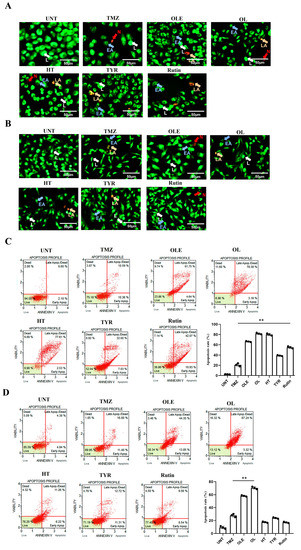 Viability of human GB cells after treatment with TMZ + OLE, TMZ + OL, TMZ + HT, TMZ + TYR, and TMZ + rutin. AO/PI staining of T98G (A) and A172 cells (B). The green cells with a granular nucleus located on one side indicate apoptosis. In contrast, a circular nucleus uniformly distributed in the center of the cell indicate a cell in interphase. The red cells with an inapparent outline indicate necrosis, dissolved or near disintegration. The color-coded arrows indicate the following: alive cells in white, early apoptosis in blue, late apoptosis in orange, and necrosis in red. (C) TMZ-only, TMZ + OLE, and TMZ + OLE phenolics induced apoptosis in T98G and (D) A172 cells. The adjusted p-values were calculated using one-way ANOVA and Tukey’s post hoc tests. ** p < 0.0001 compared to untreated cells; n = 3. UNT: untreated, TMZ: temozolomide, OLE: Olea europaea leaf extract, OL: oleuropein, HT: hydroxytyrosol, TYR: tyrosol. L: alive cells, EA: early apoptosis, LA: late apoptosis, N: necrosis.