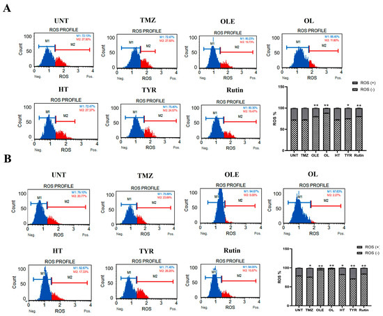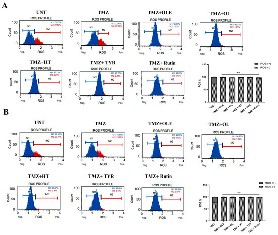 ROS levels in (A) T98G and (B) A172 cells treated with TMZ−only, TMZ + OLE, and TMZ + OLE phenolics. Data are presented as the mean ± SD. p-value was calculated as compared to TMZ-only treated cells using a two-way ANOVA test (n = 3). ** p < 0.0001. M1: ROS (−), M2: ROS (+). UNT: untreated, TMZ: temozolomide, OLE: Olea europaea leaf extract, OL: oleuropein, HT: hydroxytyrosol, TYR: tyrosol.