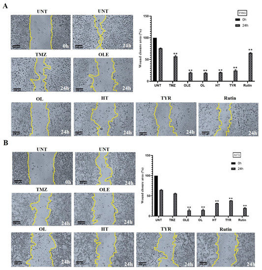 The effect of OLE phenolics on the two-dimensional migration capacity of T98G and A172 cells was evaluated by measuring the wound-healing rate after treatment with OLE phenolics. A total of 75.84% and 65.03% of the wounded area of untreated T98G and A172 cells was closed within 24 h, respectively. TMZ-only slowed the wound-healing rate to 56.96% in T98G cells (Figure 9A) and 55.14% in A172 cells (Figure 9B). Likewise, in T98G and A172 cells treated with OLE-only, 18.14% and 14.25% of the wounded area closed within 24 h (Figure 9A,B). The OLE phenolics, OL, HT, TYR, and rutin healed the scratched area by 20.33%, 21.4%, 22.66%, and 64.25% in T98G cells (Figure 9A) and by 15.22%, 32.00%, 38.5%, and 20.3% in A172 cells (Figure 9B), respectively.