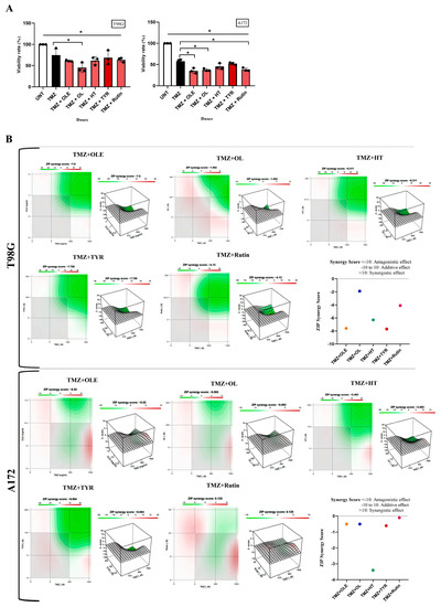 T98G and A172 cells were treated with OLE or OLE phenolics simultaneously with TMZ. While OLE + TMZ treatment decreased the cell proliferation of T98G and A172 cells by 60.56% and 35.2% compared to TMZ-only treatment, TMZ + OL, TMZ + HT, TMZ + TYR, and TMZ + rutin treatments decreased the proliferation of T98G cells by 45.1%, 61.7%, 68.5%, and 63.8% and A172 cells by 37.3%, 45.4%, 52.4%, and 38.2% compared to TMZ-only treatment (Figure 10A), respectively. In addition, the zero-interaction potency (ZIP) synergy score of OLE (T98GSZIP = −7.6; A172SZIP = −0.5), OL (T98GSZIP = −1.9; A172SZIP = −0.5), HT (T98GSZIP = −6.3; A172SZIP = −3.4), TYR (T98GSZIP = −7.7; A172SZIP = −6.0), and rutin (T98GSZIP = −4.1; A172SZIP = −0.1) predicted an additive effect when they were simultaneously used with TMZ (Figure 10B). With this, in T98G cells, the synergy scores between TMZ + OL and TMZ + rutin were higher than TMZ + OLE, whereas these combinations did not cause a difference in the synergy score of TMZ + OLE in A172 cells. In contrast, the synergy scores from TMZ + HT and TMZ + TYR were cell-type dependent. While TMZ + HT resulted in a higher synergy score than TMZ + OLE in T98G cells, its effect was the opposite in A172 cells. Likewise, while the synergy score caused by TMZ + TYR was similar to TMZ + OLE in T98G cells, it was higher than TMZ + OLE in A172 cells (Figure 10B).