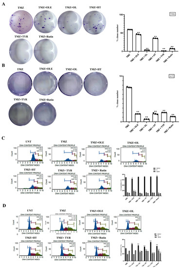 OLE and OLE phenolics additively increased TMZ suppressive capacity on the colony-forming ability of GB cells and promoted its interfering capacity on cell cycle phases. Colony-formation assays were performed using T98G and A172 cells after cotreatment with TMZ and OLE or OLE phenolics. The colony-forming ability of T98G cells (A) and A172 cells (B) following treatment with TMZ-only, TMZ + OLE, TMZ + OL, TMZ+ HT, TMZ + TYR, and TMZ + rutin. The number of colonies formed by TMZ-only treated GB cells was normalized to 100% to assess the additive effect of the OLE phenolics on TMZ-induced colony reduction. The percentage of the number of formed colonies are graphed. The G0/G1, S, and G2/M phase proportions of T98G and A172 cells (C,D) (n = 3). Data are presented as the mean ± SD. p-value was calculated as compared to untreated cells using the two-way ANOVA test (n = 3). * p < 0.05; ** p < 0.0001 versus TMZ-treated cells. UNT: untreated, TMZ: temozolomide, OLE: Olea europaea leaf extract, OL: oleuropein, HT: hydroxytyrosol, TYR: tyrosol.