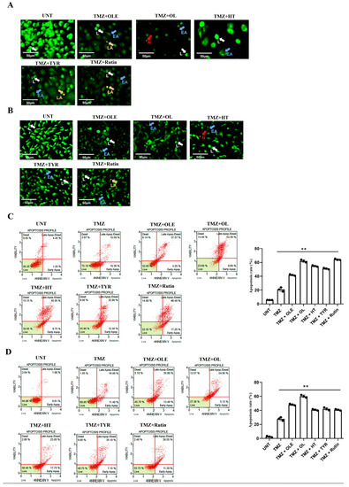 The AO/PI staining showed that treatment with OLE and its phenolics in combination with TMZ induced apoptotic cell death in T98G and A172 cells (Figure 12A,B). Likewise, TMZ + OLE increased the number of cells undergoing apoptosis compared to TMZ-only in T98G (p < 0.0001, Figure 12C) and A172 cells (p < 0.0001, Figure 12D). A greater degree of apoptosis was observed with TMZ + OL relative to TMZ (p < 0.0001) and was more effective than TMZ + OLE (p < 0.0001) in both cell lines (Figure 12C,D). It was noted that the apoptosis-inducing effect of TMZ + HT, TMZ + TYR, and TMZ + rutin was cell-type dependent. TMZ + HT and TMZ + rutin induced apoptosis compared to TMZ-only in both T98G and A172 cells. However, while these were more effective in T98G cells, a lesser apoptosis-inducing effect was demonstrated in A172 cells relative to TMZ + OLE. Conversely, TMZ-only did not affect the viability of T98G and A172 cells compared to TMZ + OLE-treated cells.