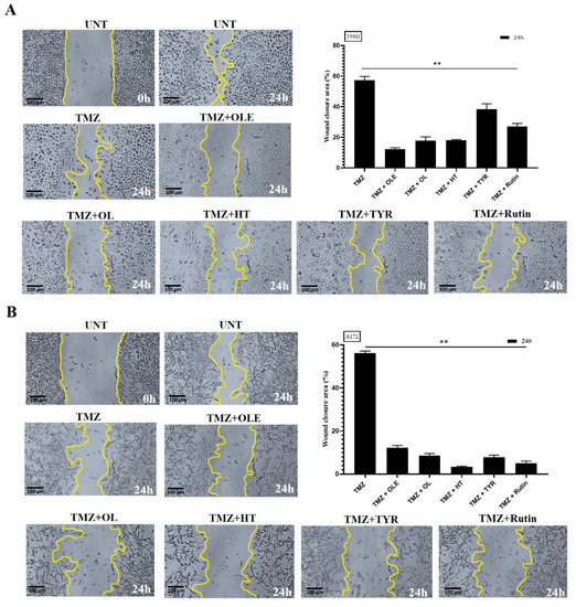 Upon a combined treatment with TMZ and OLE phenolics, the two-dimensional migration capacity of TMZ-treated GB cells was reduced by 56.96% and 55.14% of the wounded area of TMZ-only treated T98G and A172 cells, respectively, and were closed within 24 h (Figure 15A,B). TMZ + OLE slowed the wound-healing rate to 13.18% in T98G (Figure 15A) and 12.13% in A172 cells (Figure 15B). In addition, upon combined treatment with TMZ and OLE phenolics, 20.08%, 18.31%, 35.38%, and 25.1% of the wounded area in T98G cells (Figure 15A), and 8.55%, 3.3%, 7.8%, and 6.03% in A172 cells (Figure 15B), were recovered by TMZ + OL, TMZ + HT, TMZ + TYR, and TMZ + rutin, respectively.