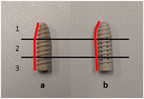 All ISs had a diameter of 9 mm and were 30 mm in length. The pitch and pitch depth of each screw design were measured using a Vernier caliper (ACCUD Co., Ltd., SuZhou, China). The pitch was measured at 2.5 mm in both screw designs. The pitching depth for the polymer and magnesium screws was 1 mm and 0.825 mm, respectively. In Figure 2, for visual observation, the screws are separated into three sections (1–3). The red line shows the body slope profile from the tip (1) to the head (3) of both IS designs.