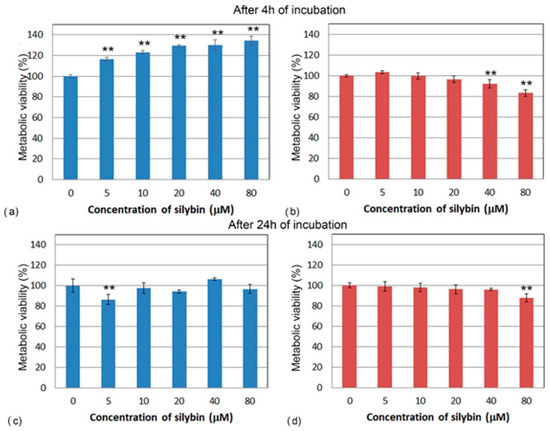 After 4 h of incubation, silybin had a stimulating effect on the metabolic viability of healthy porcine cells, even at high concentrations—40 and 80 μM. A similar effect was also observed in other studies where silibinin was complexed with metals such as copper. The complex that was produced stimulated the differentiation of osteoblast and angiogenesis in vitro in healthy cells [16].