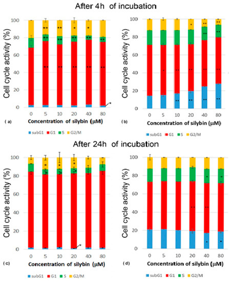 Effect of different concentrations of silybin on the cell cycle phases (%) in IPEC-1 cells after (a) 4 h and (b) 24 h incubation and in CaCo-2 cells (c) after 4 h and (d) 24 h incubation. The stars indicate significant difference from untreated cells; the level of significance: * p ˂ 0.05 and ** p ˂ 0.01.