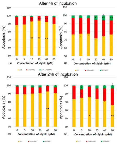 Effect of different concentrations of silybin on the apoptosis in IPEC-1 cells after (a) 4 h and (b) 24 h incubation and in CaCo-2 cells (c) after 4 h and (d) 24 h incubation. The stars indicate significant difference from untreated cells; the level of significance: * p ˂ 0.05 and ** p ˂ 0.01. The orange parts of the bars represent living cells, the red parts represent cells in the early stage of apoptosis, and the green parts represent cells in late apoptosis or dead cells.