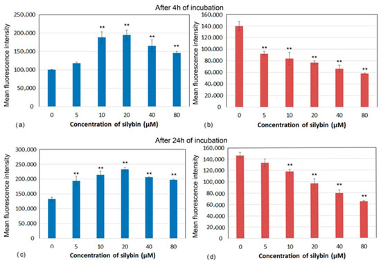 Membrane potential (mean fluorescence intensity) of (a,c) IPEC-1 and (b,d) CaCo-2 cells treated with different concentrations of silybin (n = 4) after 4 h (a,b) and 24 h incubation (c,d). The stars indicate significant difference from untreated cells; the level of significance: ** p ˂ 0.01.