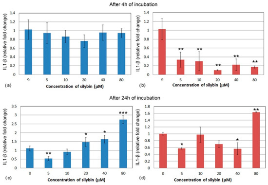 Relative gene expression of IL-1 (ΔΔCt) in (a,c) IPEC-1 cells (blue bars) and (b,d) CaCo-2 cells (red bars) treated with different concentrations of silybin (n = 4) after 4 h (a,b) and 24 h incubation (c,d). The stars indicate significant difference from untreated cells; the level of significance: * p ˂ 0.05, ** p ˂ 0.01, *** p ˂ 0.001.