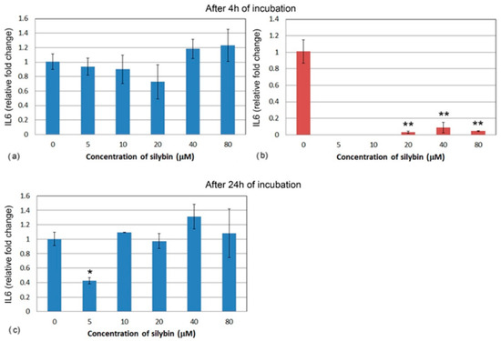 Relative gene expression of IL6 (ΔΔCt) in (a,c) IPEC-1 (blue bars) and (b) CaCo-2 cells (red bars) treated with different concentrations of silybin (n = 4) after 4 h cultivation (a,b) and 24 h (c). The stars indicate significant difference from untreated cells; the level of significance: * p ˂ 0.05, ** p ˂ 0.01.