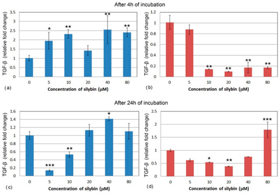 Relative gene expression of TGF-β (ΔΔCt) in (a,c) IPEC-1 cells (blue bars) and (b,d) CaCo-2 cells (red bars) treated with different concentrations of silybin (n = 4) after 4 h (a,b) and 24 h (c,d) cultivation. The stars indicate significant difference from untreated cells; the level of significance: * p ˂ 0.05, ** p ˂ 0.01, *** p ˂ 0.001.