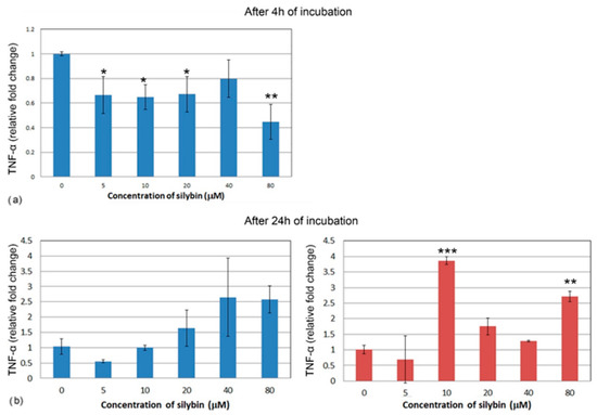After 4 h of incubation, the IPEC-1 cells showed a decrease in relative expression for TNF-α in all of the concentrations of silybin except for the 40 μM concentration, with the most significant change in the 80 μM group (Figure 8a). CaCo-2 cells did not show TNF-α gene expression after 4 h of incubation; therefore, it is not presented here. Following 24 h of incubation, no significant change was recorded in the IPEC-1 cells, although an overall increase was noted (Figure 8b). In CaCo-2 cells, a significant increase in gene expression of TNF-α was found in the groups treated with 10 μM and 80 μM of silybin (Figure 8c).