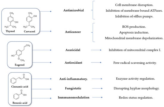 These natural compounds have been extensively studied and may be responsible for the bioactivities of the essential oils containing them [10]. The modes of action of these natural bioactive compounds are under intense investigation, although some of them have been relatively well described. Figure 1 depicts some of the bioactivities exhibited by each compound described above and the modes of action by which they are exerted [11,12,13,14,15,16,17].
