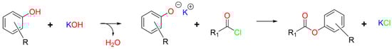 Chemical synthesis of the six hybrid molecules was achieved by means of bimolecular nucleophilic substitution. First, 50 mmol of the phenolic compound was stirred in a 10 mL KOH solution (5 mmol/mL) until neutralization. To the prior solution, 100 mmol of acyl chloride were slowly added. The mixture was continually stirred at room temperature (25 °C) for 2 h. The resulting mixture was submitted to liquid-liquid extraction, stirring it overnight with n-hexane and aqueous KOH saturated solution. The organic phase was recovered and the aqueous phase was discarded. The organic phase was dried over anhydrous sodium sulphate and filtered, and the solvent was evaporated under reduced pressure. Chemical characterization of products was carried out by means of GC-MS analysis. The structural features and purity of the obtained hybrid molecules were confirmed via 1H NMR analysis. Figure 2 shows the general reaction scheme for the chemical synthesis of the six hybrid molecules obtained.