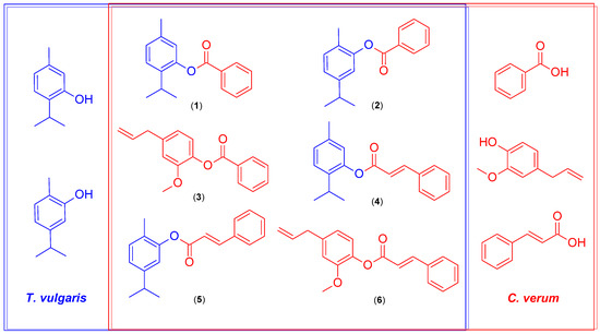 In total, six hybrid EO-based molecules were obtained via chemical synthesis. Figure 3 shows the structures of the six hybrids corresponding to esters of benzoic acid and cinnamic acid with the main constituents of T. vulgaris EO (thymol and carvacrol) and C. verum EO (eugenol).