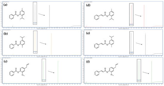 Chromatograms obtained via GC-MS of the chemical reaction products. (a) Chromatogram of 2-Isopropyl-5-methylphenyl benzoate (1); (b) chromatogram of 5-Isopropyl-2-methylphenyl benzoate (2); (c) chromatogram of 4-Allyl-2-methoxyphenyl benzoate (3); (d) chromatogram of 2-Isopropyl-5-methylphenyl cinnamate (4); (e) chromatogram of 5-Isopropyl-2-methylphenyl cinnamate (5); (f) chromatogram of 4-Allyl-2-methoxyphenyl cinnamate (6).