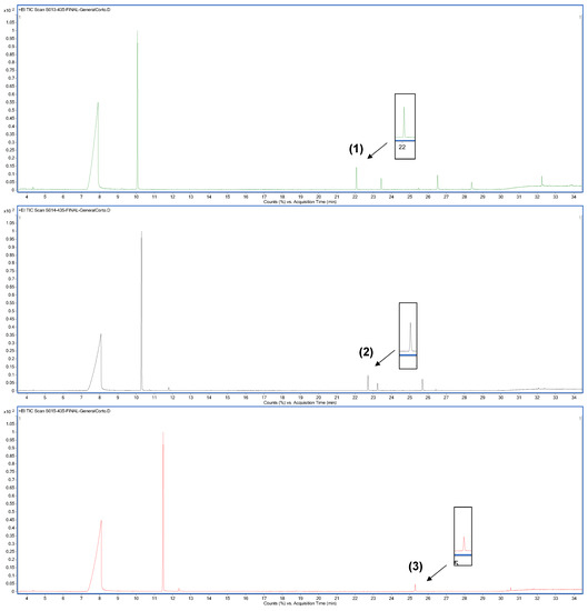 Chromatograms obtained via GC-MS of the enzymatic reaction products, obtaining (1), (2) and (3).